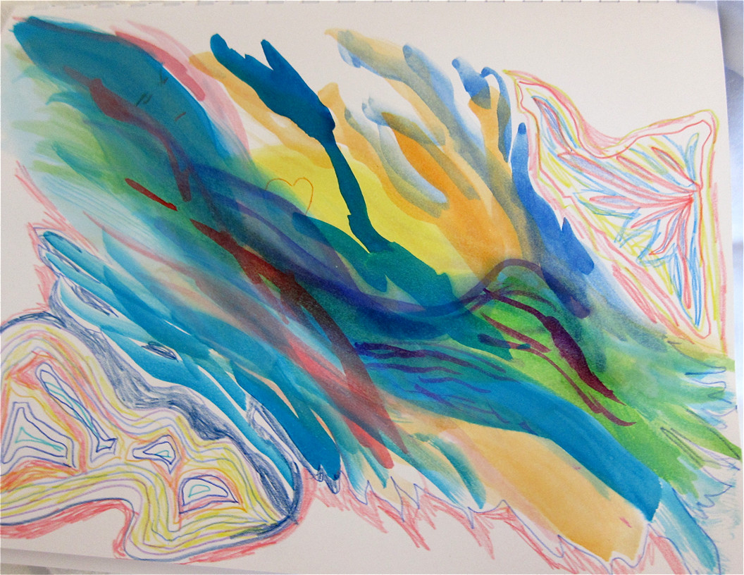 My final story this morning is one in which my participation was minimal. One afternoon while going over the list of her patients to tell me who she thought might be available, one of my favorite nurses described a woman in her mid 50s as being sad, frustrated and depressed. She said that the patient lived alone but had an adult son who couldn’t seem to help her handle things such as her insurance problems and other arrangements. She had been trying to negotiate between him and the insurance company all morning. So, I expected to see a reluctant frustrated woman. Instead the patient told me very pleasantly that someone had told her I might come by. She was alert and enthusiastic, although I could tell she was in some pain. I almost never encounter patients who just want to dive in and create something on their own, but this patient could hardly wait. She said she liked to work with all kinds of media: oil paint, acrylics, colored markers, pencils, and water- colors. I opened my bag of supplies and she chose water colors and colored pencils.